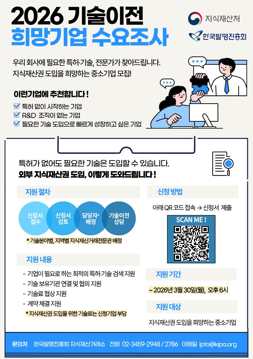 이에 2026 기술이전 희망기업 수요조사를 진행하고자 하오니, 관심 있으신 중소기업의 많은 관심과 신청 바랍니다!