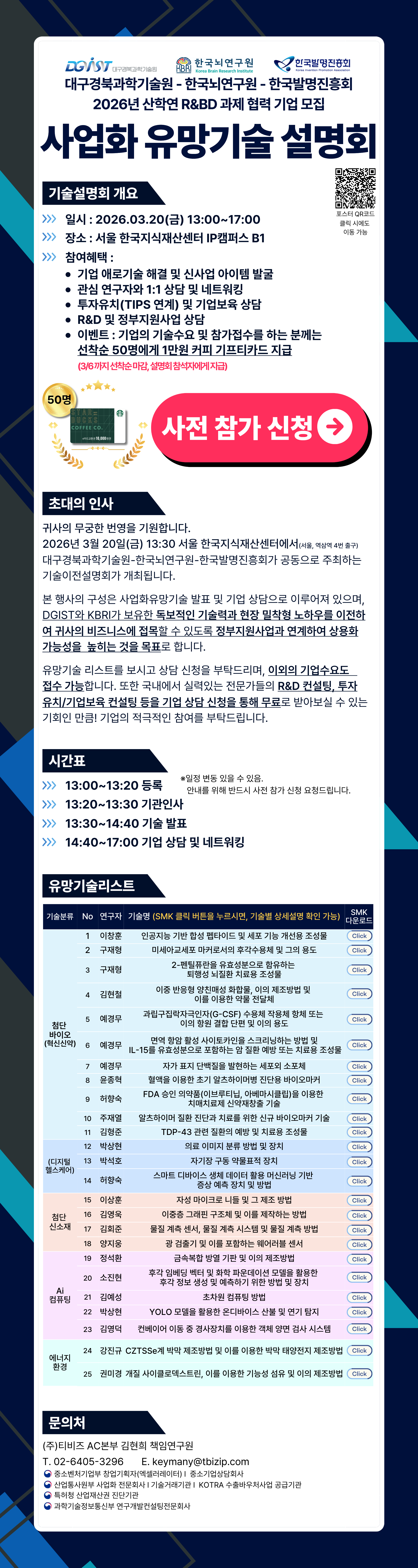 본 행사는 사업화 유망기술 발표 및 기업 상담으로 구성되며, 기업의 기술수요를 접수받아 관심 연구자와 1:1 상담/네트워킹을 지원합니다.